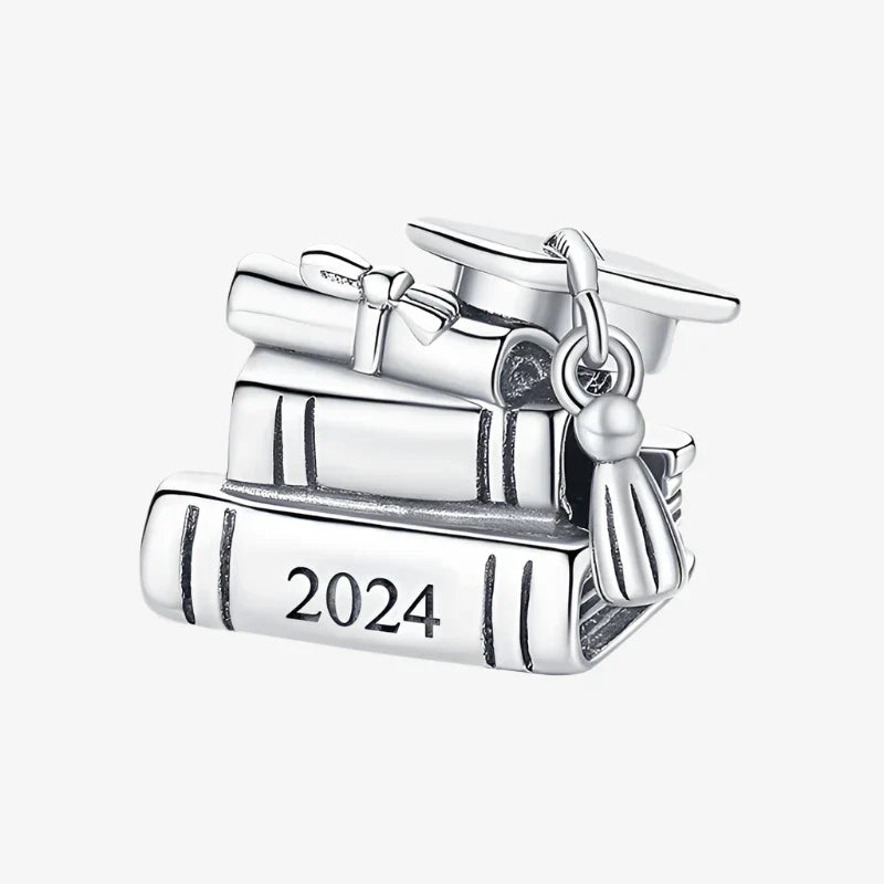 Celebrate the achievement of a significant milestone with our charming 2024 Graduation Charm. Expertly crafted from lustrous sterling silver, this delightful piece features intricately designed books, a diploma, and a graduation cap, all beautifully inscribed with "2024." Perfect for personalizing your bracelet, it serves as a heartfelt tribute to hard work, dedication, and the bright future that lies ahead. Commemorate this momentous occasion with this stunning charm, a timeless keepsake to cherish the journey and all the possibilities that await!