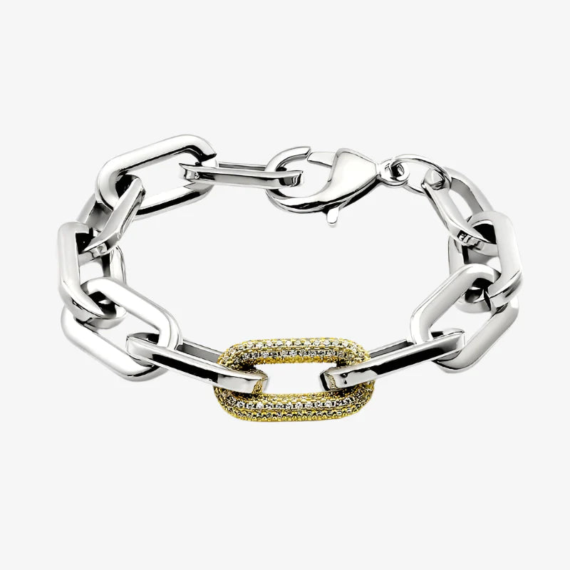 Discover the perfect fusion of elegance and strength with the Bond Chain Bracelet. Crafted from sterling silver, this bracelet features a bold chain design, with a striking central link encrusted with sparkling diamonds set in warm gold. The combination of silver and gold adds a sophisticated contrast, making this piece a versatile addition to any jewellery collection. Ideal for both everyday wear and special occasions, the Bond Chain Bracelet is a timeless expression of luxury and style.