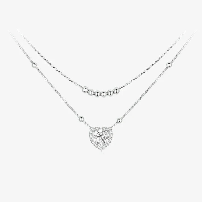 Illuminate your style with our Double Heart Radiance Necklace, a stunning representation of love and elegance. This exquisite piece features two sterling silver chains: the shorter chain adorned with six sparkling focal points that radiate brilliance, while the longer chain showcases a striking heart pendant, accented by shimmering stones scattered around it. Perfectly designed to celebrate the beauty of connection, this necklace is ideal for layering or wearing solo, making it a timeless addition to any jewelry collection.