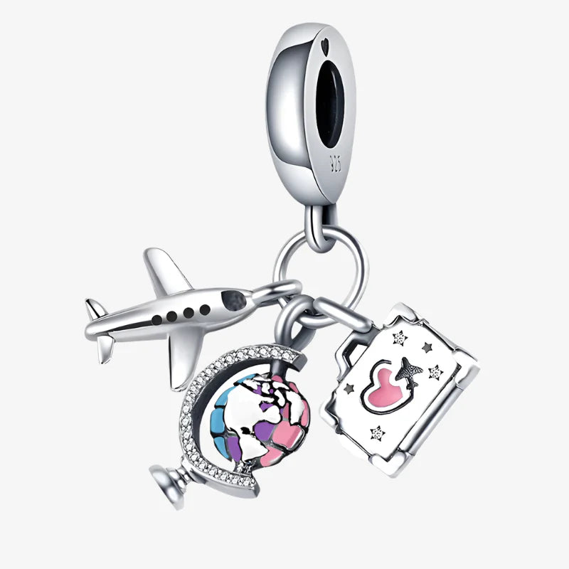 Embrace your wanderlust with the Explorer's Dream Dangle Charm. This set features three captivating travel-inspired designs: a plane, symbolising the thrill of exploration; a globe, coloured in light blue, purple, and soft pink, representing the world’s endless possibilities; and a suitcase, adorned with a heart in soft pink, adding a touch of love to every journey. Crafted from sterling silver, this charm is perfect for personalising your bracelet with a sense of adventure and discovery.