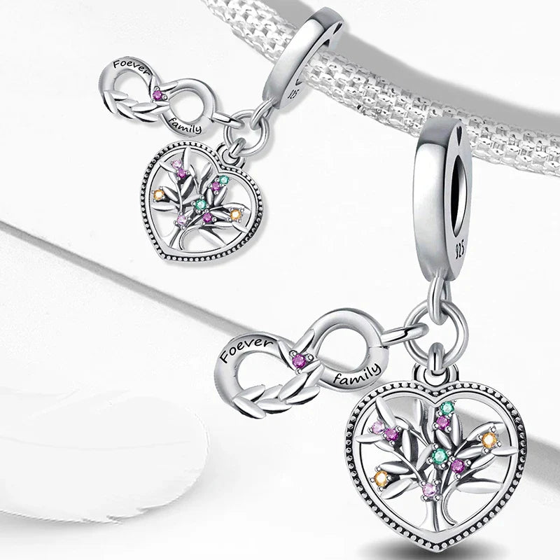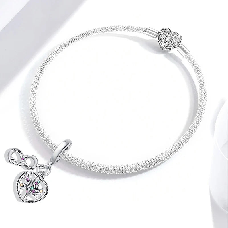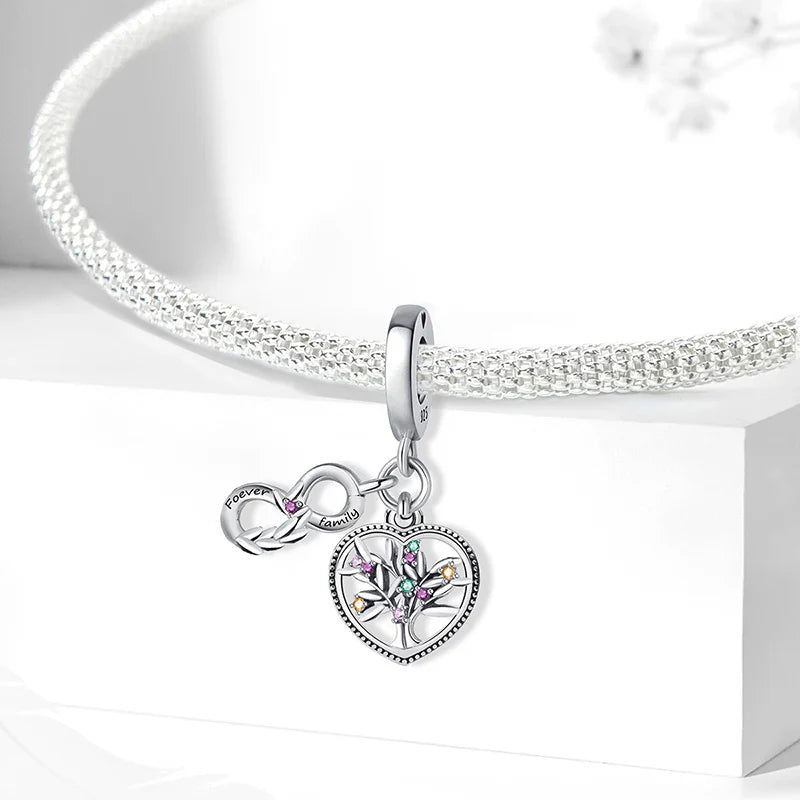 Celebrate the eternal bond of family with the Forever Family Tree Dangle Charm. This unique charm features two beautiful designs: one side showcases the words "forever family" engraved within the infinity symbol, with a heart at its centre, symbolising unbreakable love. The other side features a family tree design, adorned with brilliant multicoloured stones, representing the many branches of family connections.