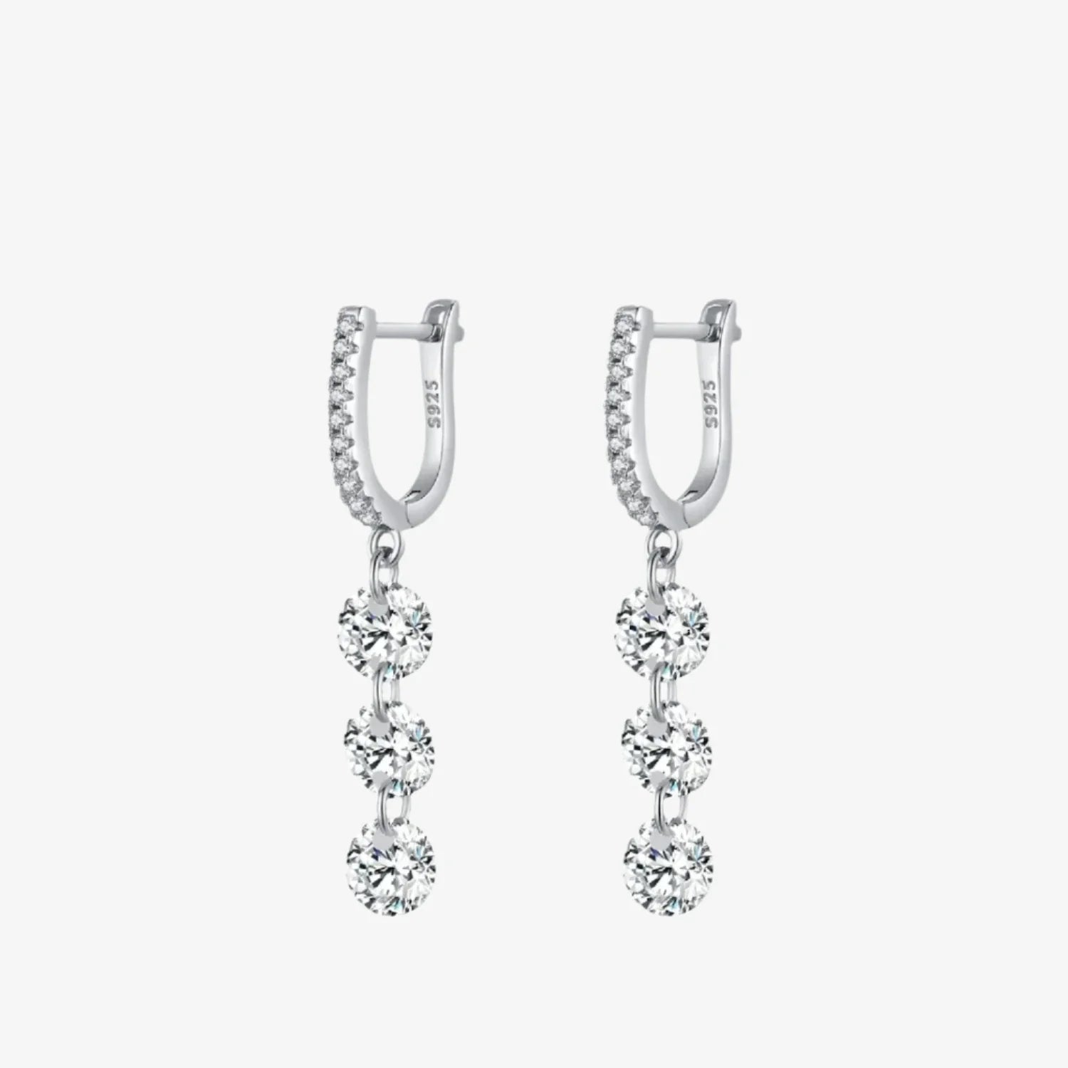 The Sparkling Harmony Drop Earrings are a captivating blend of elegance and brilliance. Featuring three stunning stones along the drop profile, these earrings create a mesmerizing effect with every movement. The delicate hoop is further enhanced with a pavé of sparkling stones, adding extra shimmer to this already radiant design. Perfect for special occasions or to add a touch of sophistication to your everyday look.