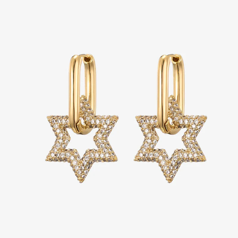 Illuminate your look with the Starry Pavé Hoop Earrings, a stunning design that showcases a unique star-shaped silhouette. Adorned with a sparkling pavé of brilliant stones, these earrings exude a celestial allure that will captivate and inspire. Perfect for adding a touch of whimsy and elegance to any outfit, they are an exquisite choice for both special occasions and everyday wear.